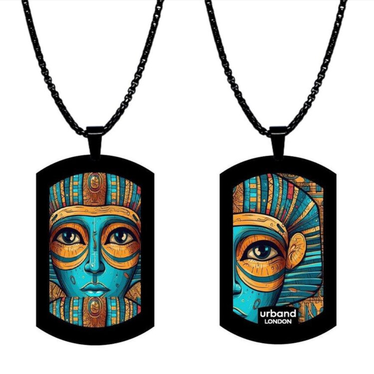 Stainless steel designer double-sided medium size pendant 24mm x 40mm handmade in London - Art Egyptian Tutankhamun Metallic