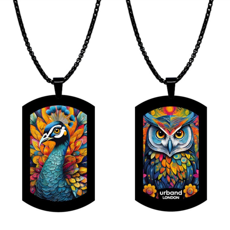 Stainless steel designer double-sided pendant 24mm handmade in London - Art peacock vs owl Metallic