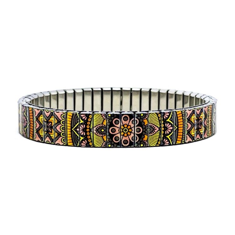 Stainless steel designer bracelet 10mm handmade in London - Carnival golden flowers mandala Metallic