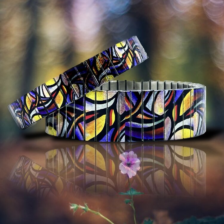 Stainless steel designer bracelet 18mm handmade in London - Checkers Kites summer leaves Metallic