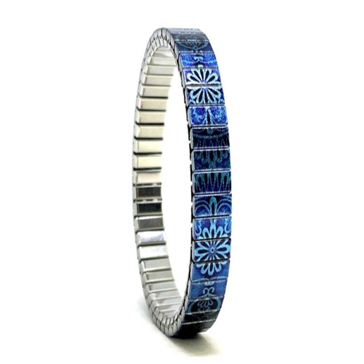 Stainless steel designer bracelet 6mm handmade in London - Circles Mandala blue flowers Metallic