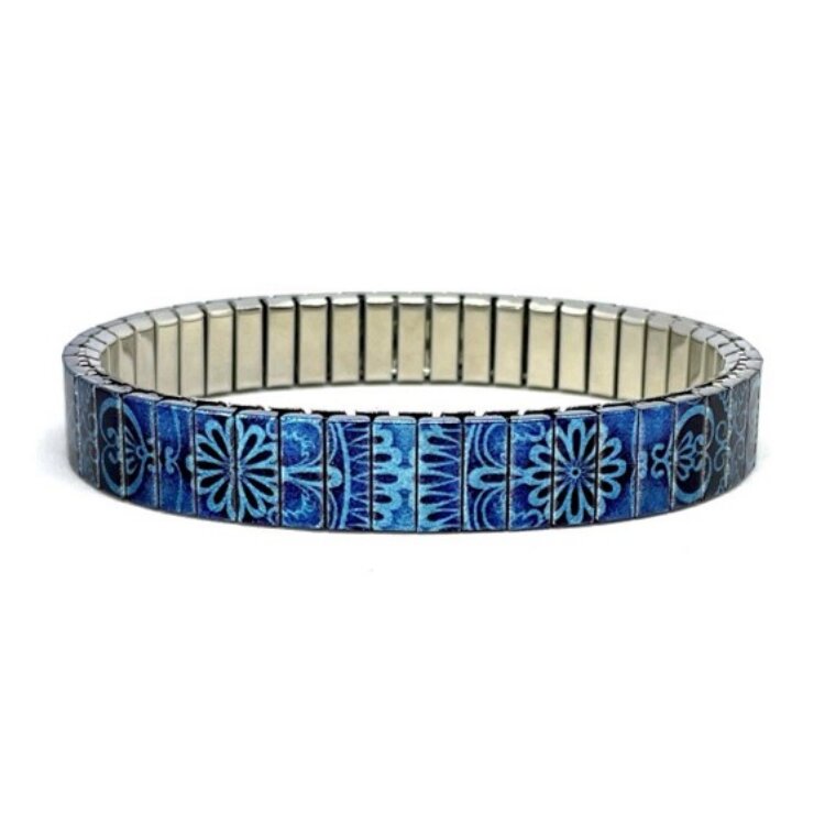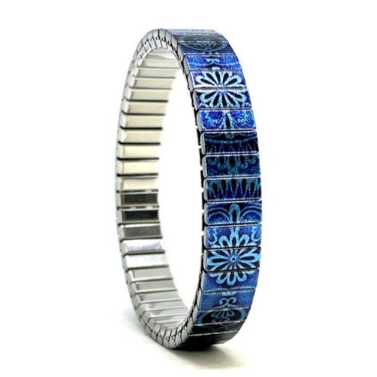 Stainless steel designer bracelet 10mm handmade in London - Circles Mandala blue flowers Metallic