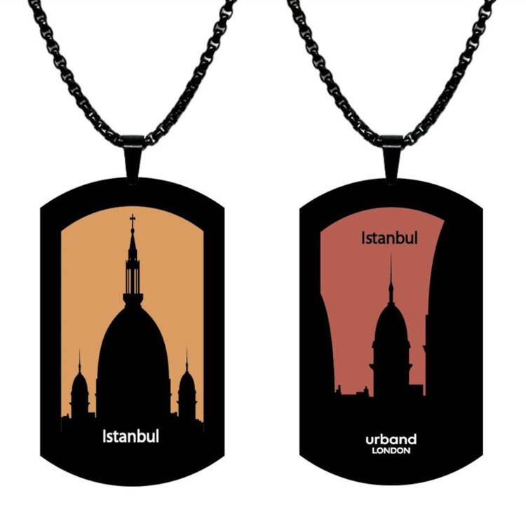 Stainless steel designer double-sided large size pendant 29mm x 50mm handmade in London - Cities Istanbul skyline Metallic