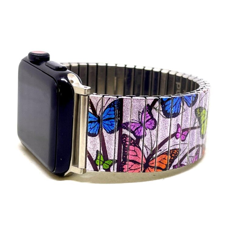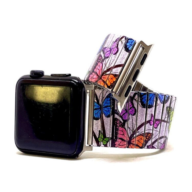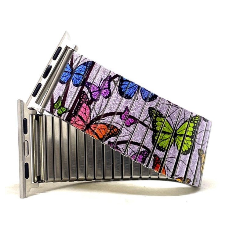 Stainless steel designer bracelet for smart watch 22mm handmade in London - Cool Blossom butterflies velvet pastel Metallic