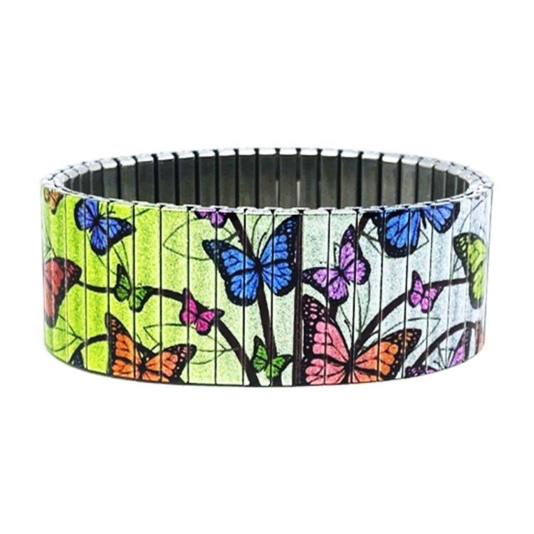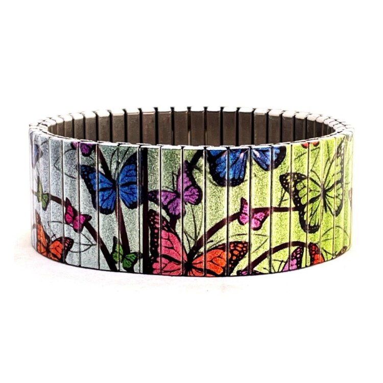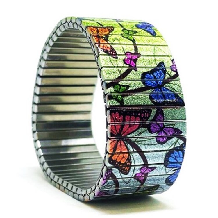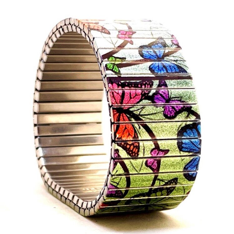 Stainless steel designer bracelet 22mm handmade in London - Cool Blossom butterflies green pastel Metallic