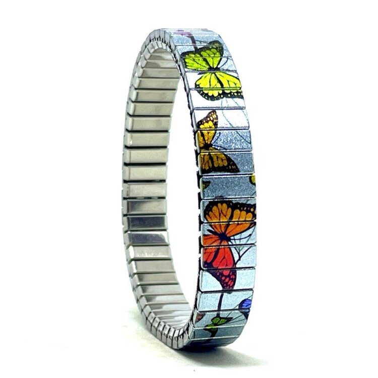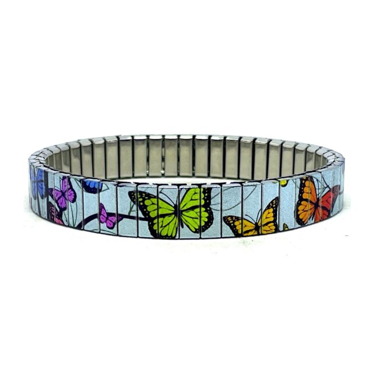 Stainless steel designer bracelet 10mm handmade in London - Cool Blossom butterflies blue sky Metallic