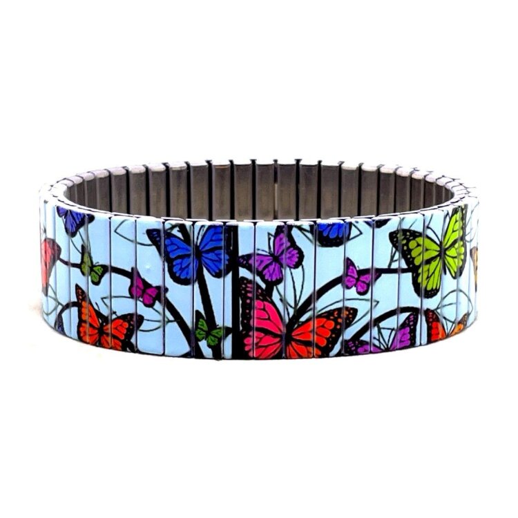Stainless steel designer bracelet 18mm handmade in London - Cool Blossom butterflies blue sky
