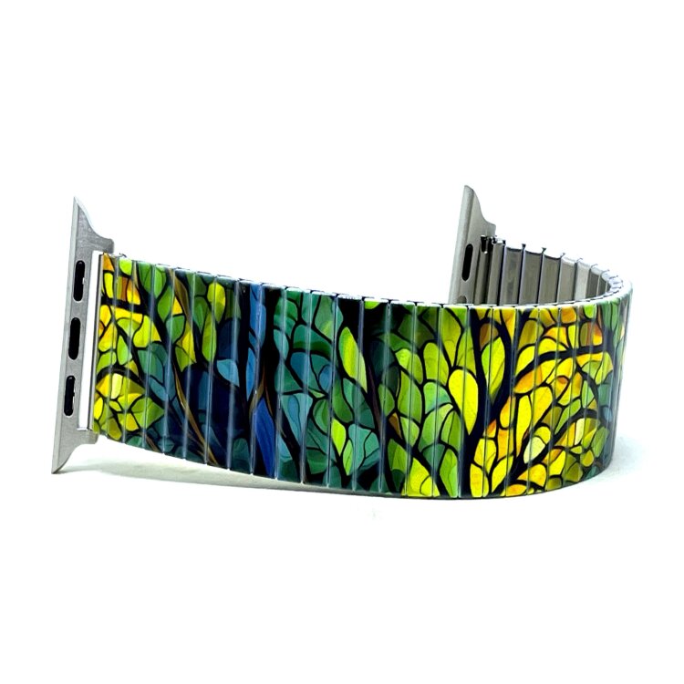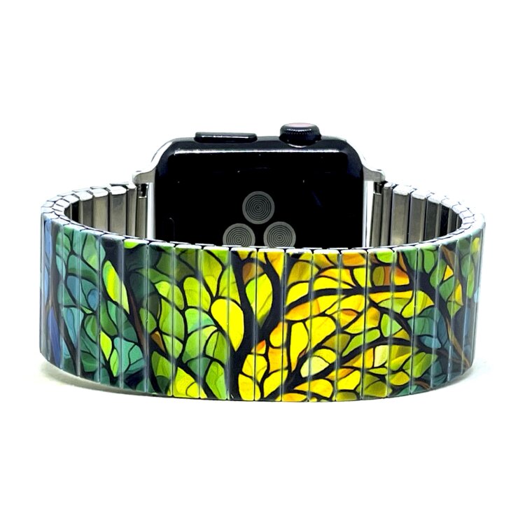 Stainless steel designer bracelet for smart watch 22mm handmade in London - Cool Blossom sunrise in the forest