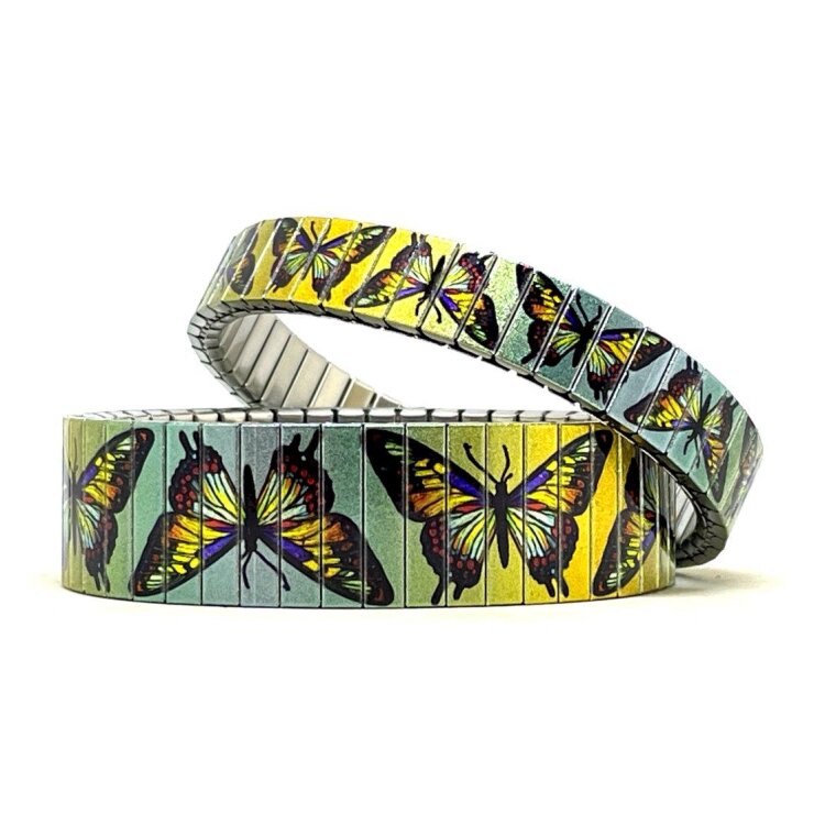 Stainless steel designer bracelet 18mm handmade in London - Cool Blossom butterflies golden green buzz Metallic