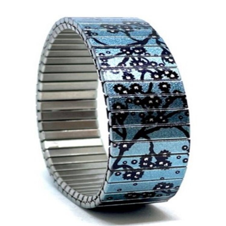 Stainless steel designer bracelet 22mm handmade in London - Cool Blossom turquoise cherry blossom Metallic