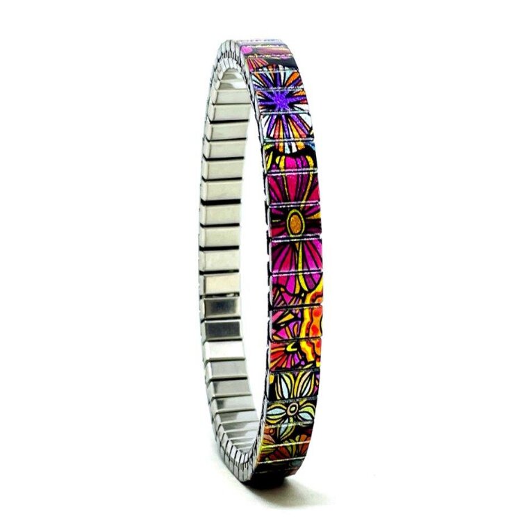 Stainless steel designer bracelet 6mm handmade in London - Flowers Daisies red psychedelica Metallic