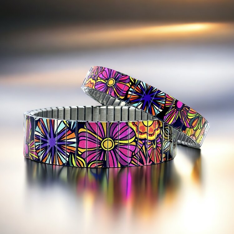 Stainless steel designer bracelet 18mm handmade in London - Flowers Daisies red psychedelica Metallic