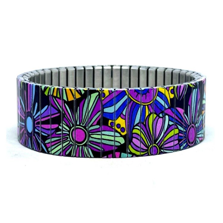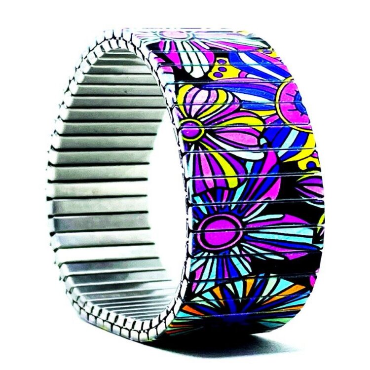 Stainless steel designer bracelet 22mm handmade in London - Flowers Daisies blue psychedelica Metallic