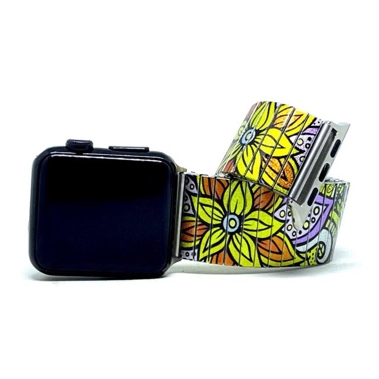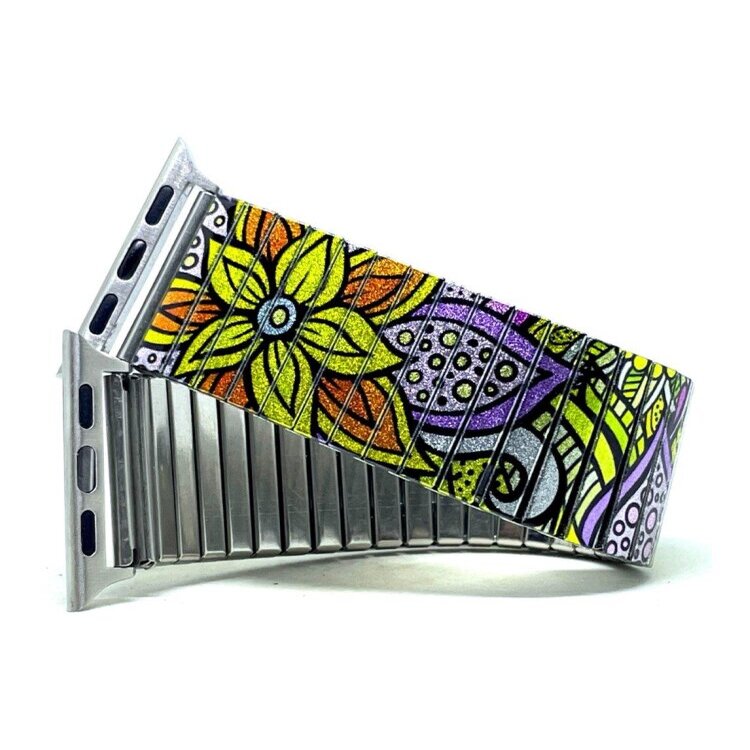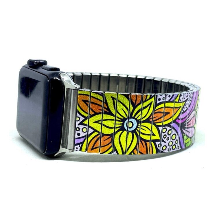 Stainless steel designer bracelet for smart watch 18mm handmade in London - Flowers Daisies pastel psychedelica Metallic