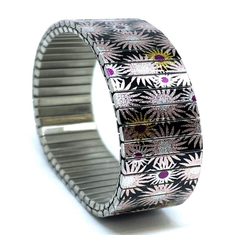 Stainless steel designer bracelet 22mm handmade in London - Flowers Garden pink stars Metallic