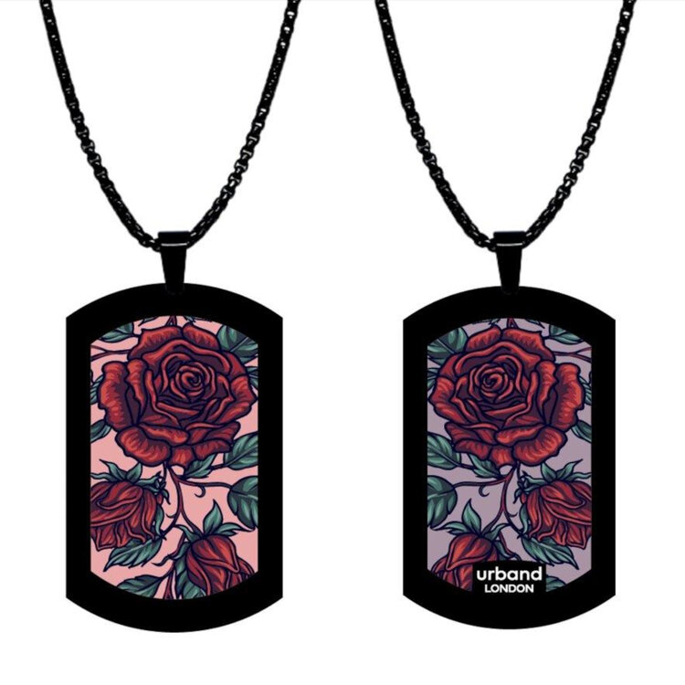 Stainless steel designer double-sided medium size pendant 24mm x 40mm handmade in London - Flowers Garden ruby roses Metallic