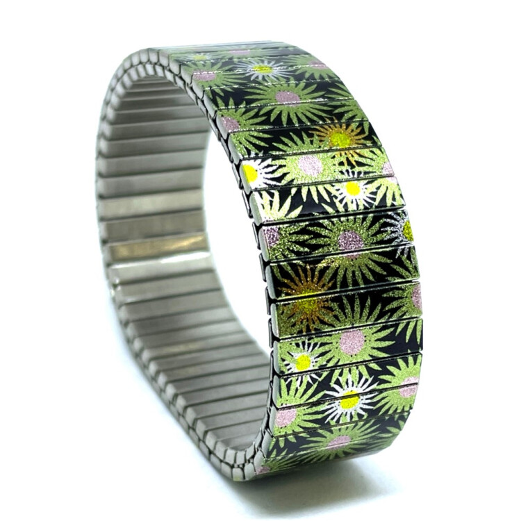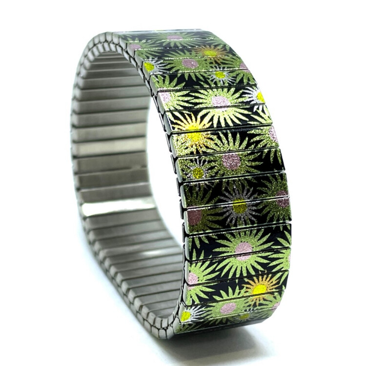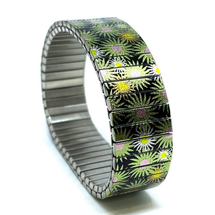 Stainless steel designer bracelet 18mm handmade in London - Flowers Garden green stars Metallic