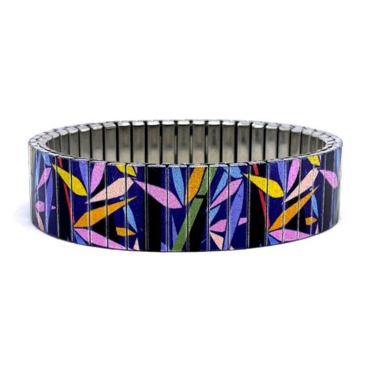Stainless steel designer bracelet 18mm handmade in London - Flowers Garden blue bamboo Metallic