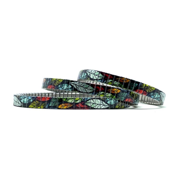 Stainless steel designer bracelet 6mm handmade in London - Flowers Garden colourful leaves Metallic