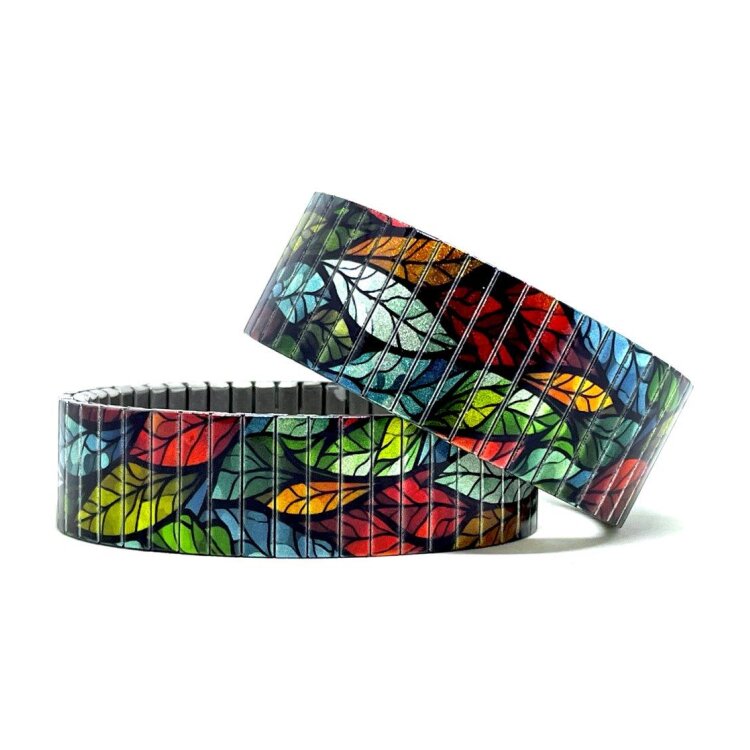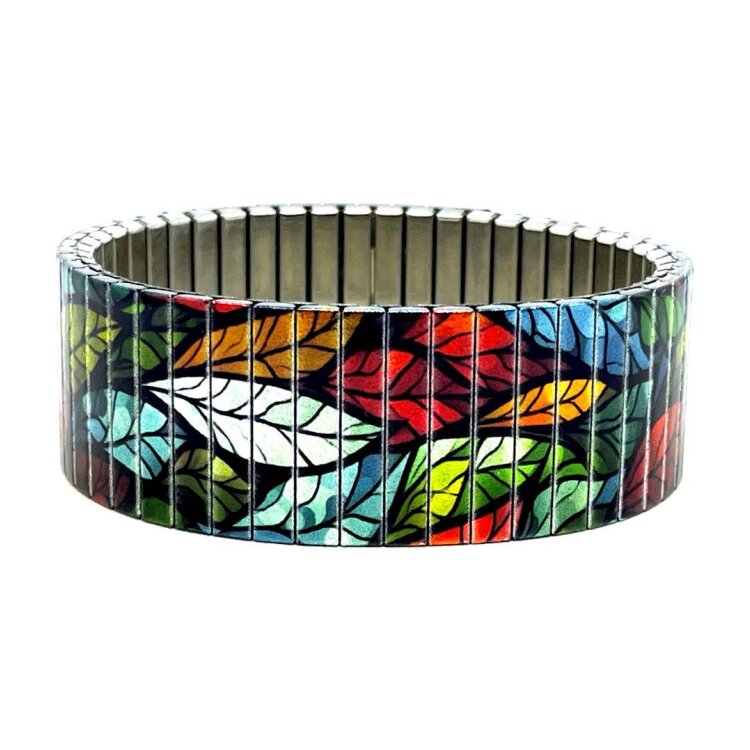 Stainless steel designer bracelet 22mm handmade in London - Flowers Garden colourful leaves Metallic