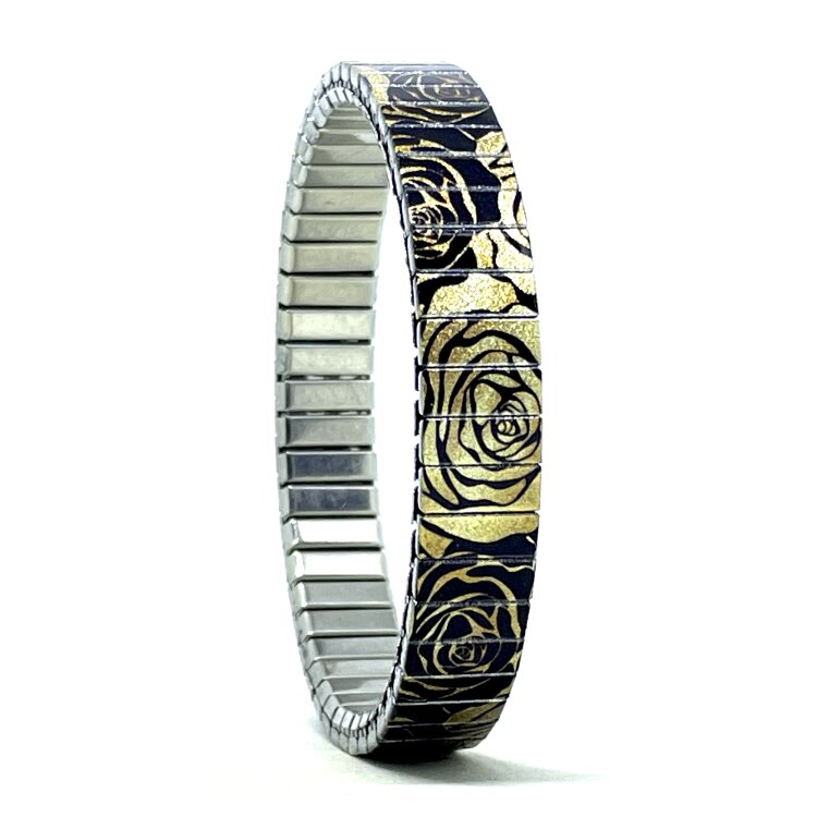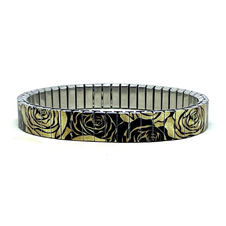 Stainless steel designer bracelet 10mm handmade in London - Flowers Garden golden black roses Metallic