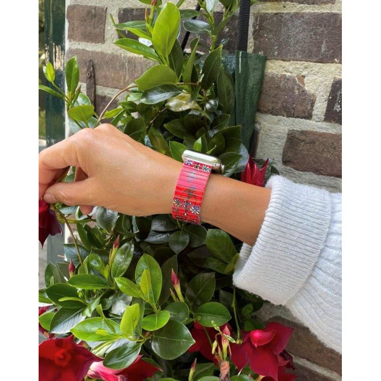 Stainless steel designer bracelet for smart watch 22mm handmade in London - Flowers Mandala red extravaganza