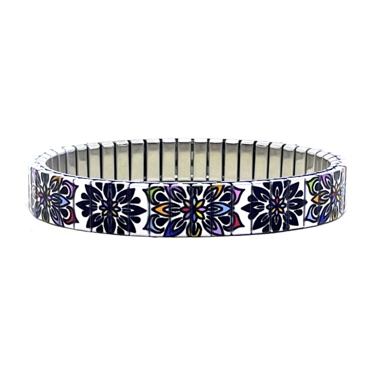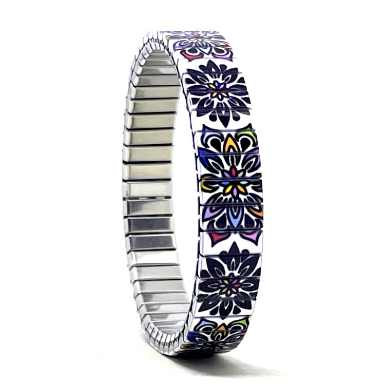 Stainless steel designer bracelet 10mm handmade in London - Flowers Mandala multi colour crowns with black stars