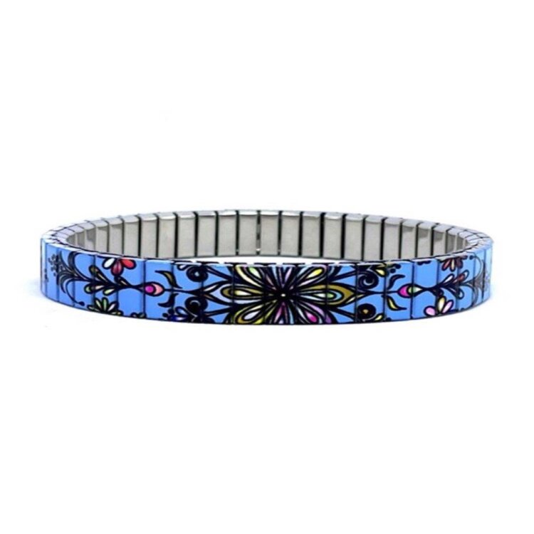 Stainless steel designer bracelet 6mm handmade in London - Flowers Mandala blue extravaganza