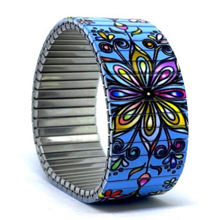 Stainless steel designer bracelet 22mm handmade in London - Flowers Mandala blue extravaganza
