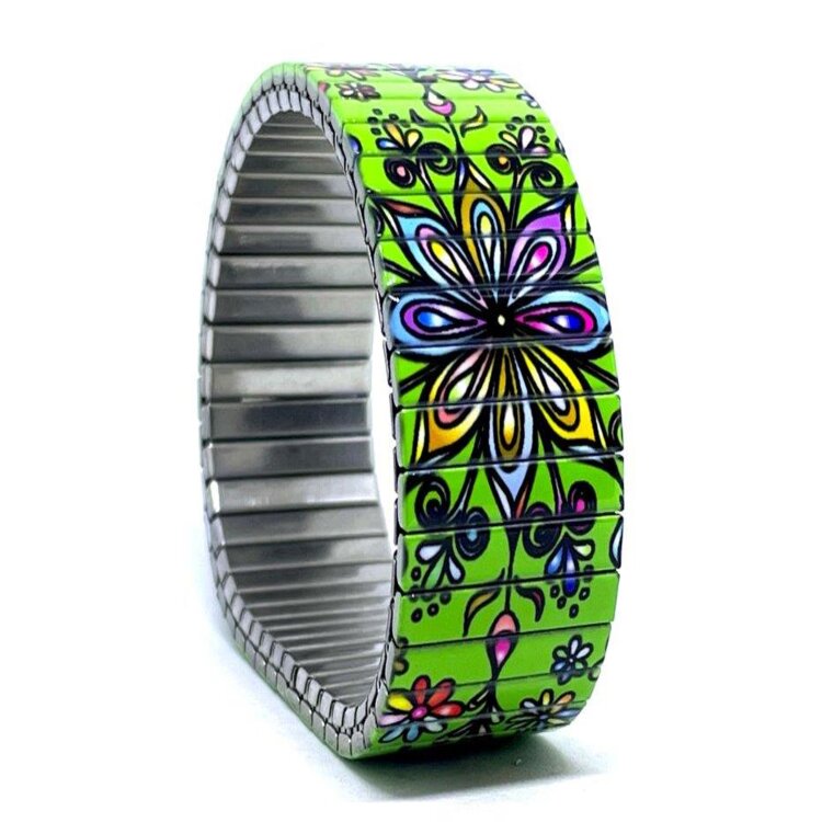 Stainless steel designer bracelet 18mm handmade in London - Flowers Mandala green extravaganza