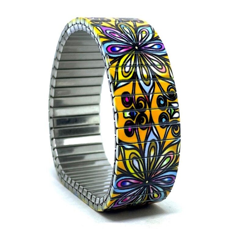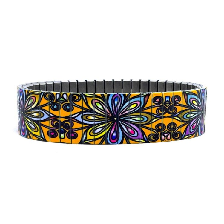 Stainless steel designer bracelet 18mm handmade in London - Flowers Mandala orange kaleidoscope