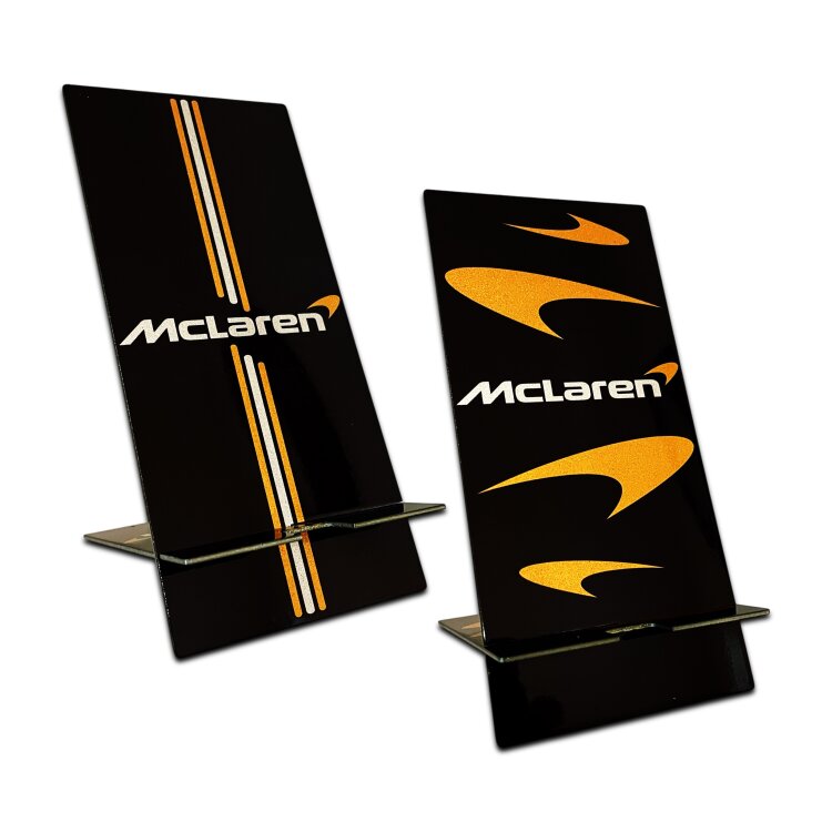 Stainless steel designer double-sided smartphone stand handmade in London - Formula 1 McLaren Metallic