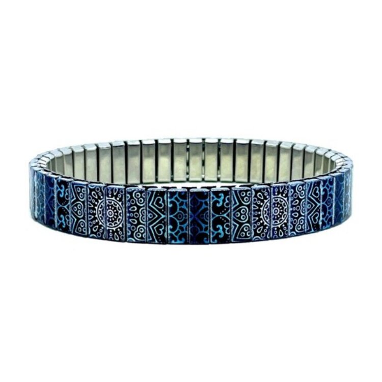 Stainless steel designer bracelet 10mm handmade in London - Mandala Daisies blue cool flowers Metallic