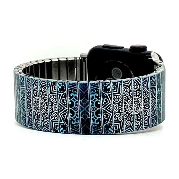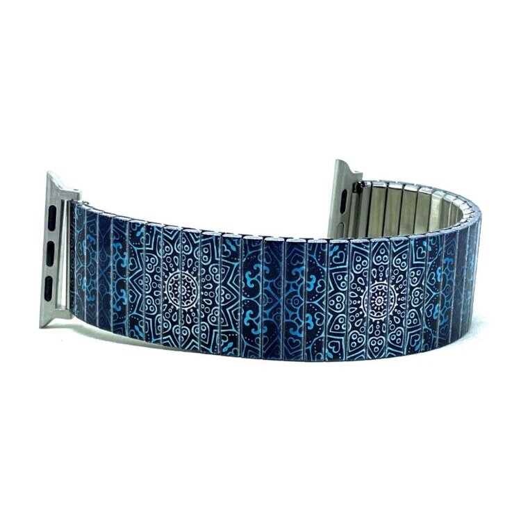 Stainless steel designer bracelet for smart watch 18mm handmade in London - Mandala Daisies blue cool flowers Metallic