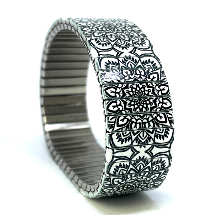 Stainless steel designer bracelet 18mm handmade in London - Mandala Daisies classic black