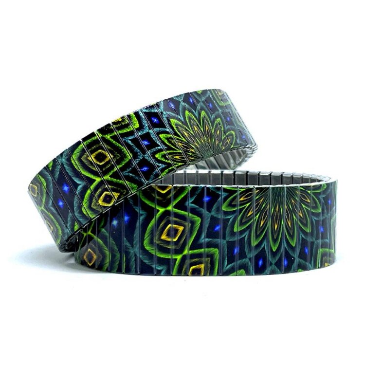 Stainless steel designer bracelet 22mm handmade in London - Mandala Daisies peacock Metallic