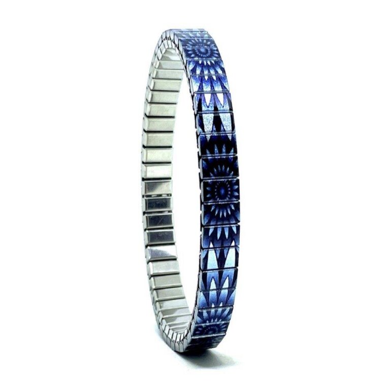 Stainless steel designer bracelet 6mm handmade in London - Mandala Daisies vintage blue Metallic