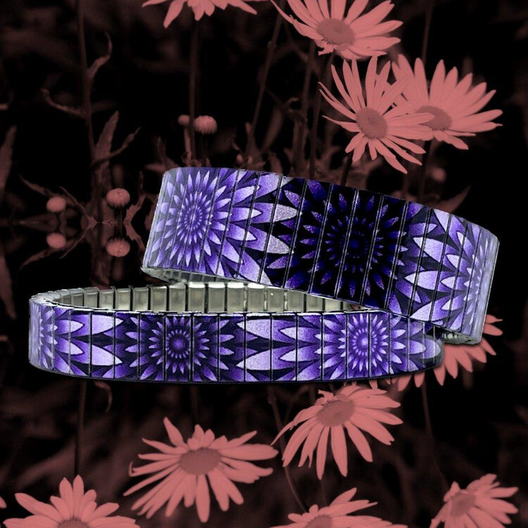 Stainless steel designer bracelet 18mm handmade in London - Mandala Daisies vintage purple Metallic