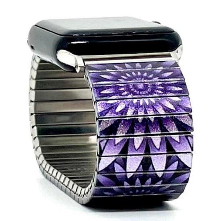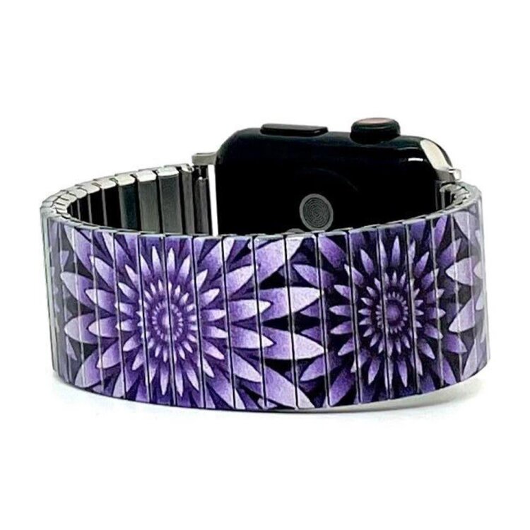 Stainless steel designer bracelet for smart watch 22mm handmade in London - Mandala Daisies vintage purple Metallic