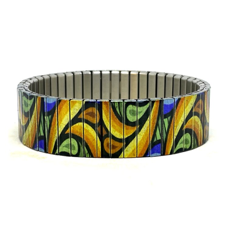 Stainless steel designer bracelet 18mm handmade in London - Mandala Daisies golden green wall art Metallic