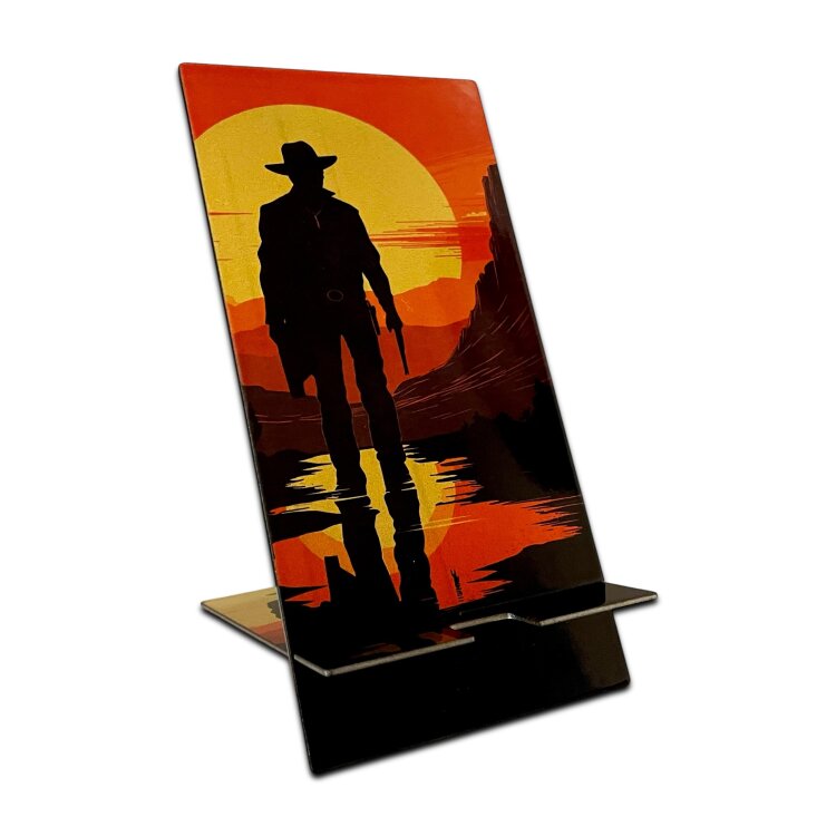 Stainless steel designer double-sided smartphone stand handmade in London - Music and Films Wild West Metallic