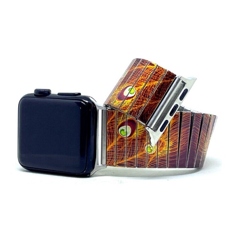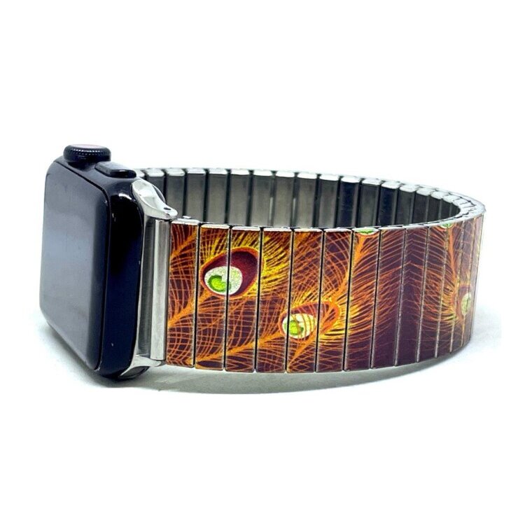Stainless steel designer bracelet for smart watch 18mm handmade in London - Peacock feathers neon gold Metallic