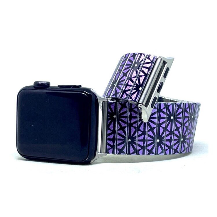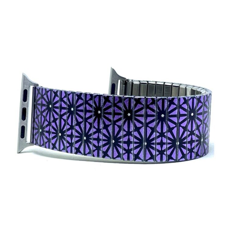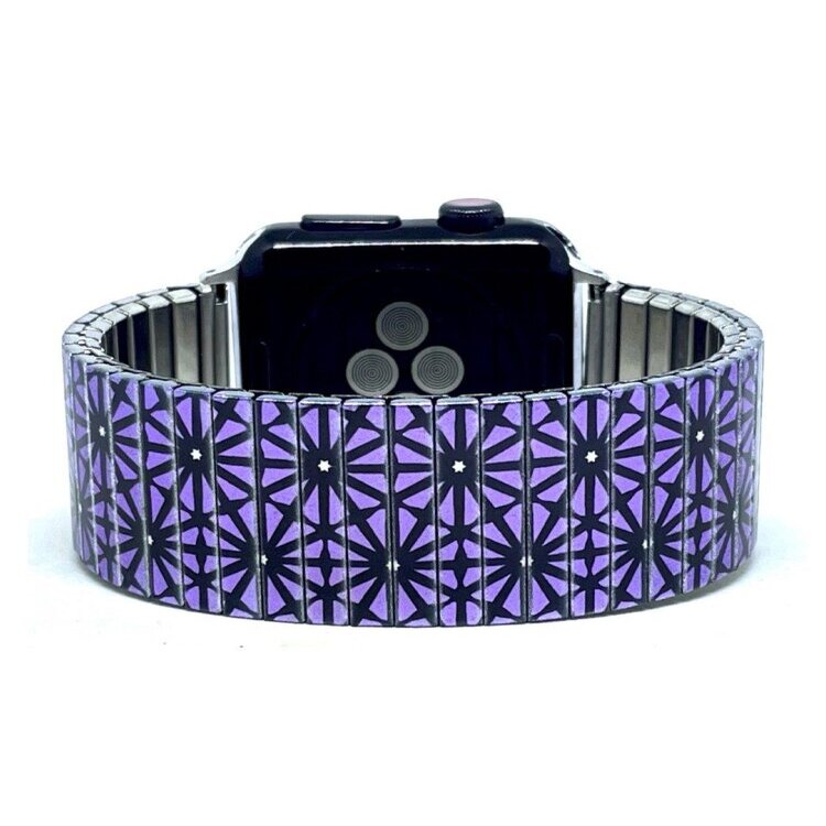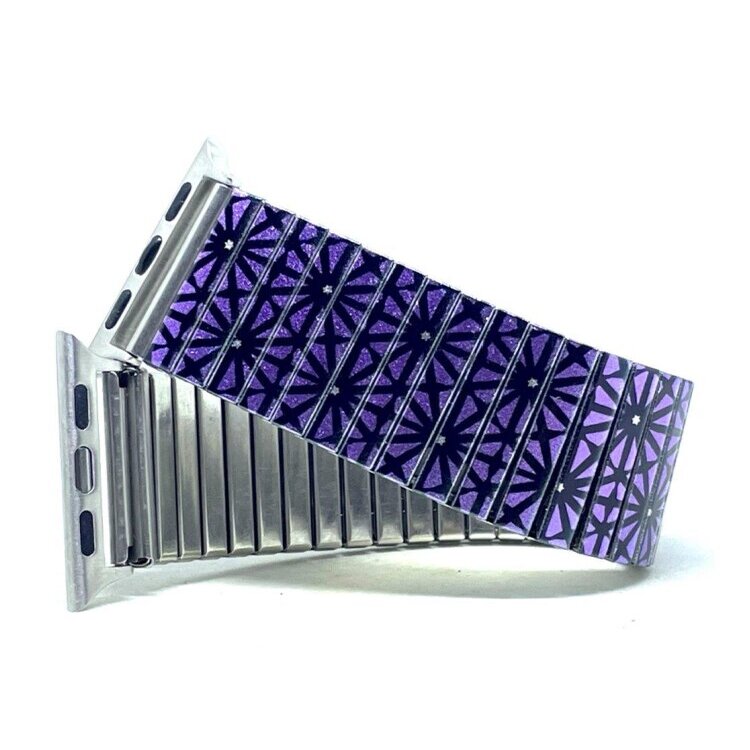 Stainless steel designer bracelet for smart watch 18mm handmade in London - Stars Triangled purple flowers Metallic