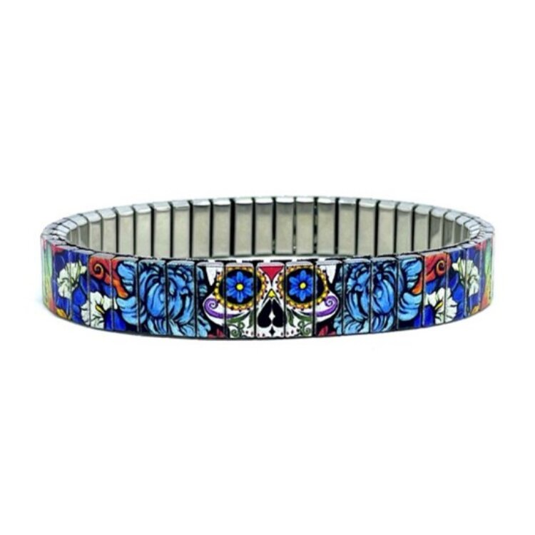 Stainless steel designer bracelet 10mm handmade in London - Sugar Skulls paradise Metallic
