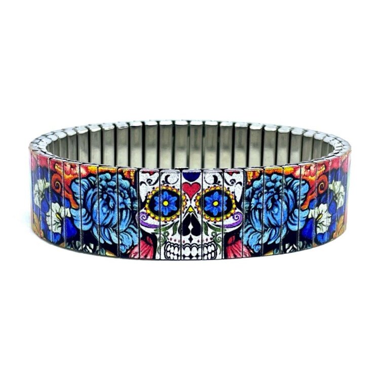 Stainless steel designer bracelet 18mm handmade in London - Sugar Skulls paradise Metallic