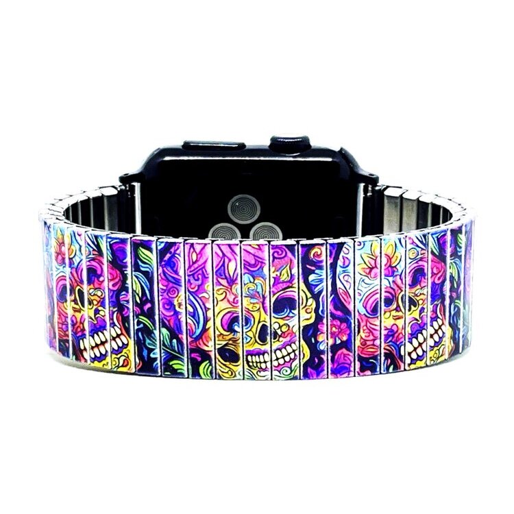 Stainless steel designer bracelet for smart watch 18mm handmade in London - Sugar Skulls purple pain Metallic
