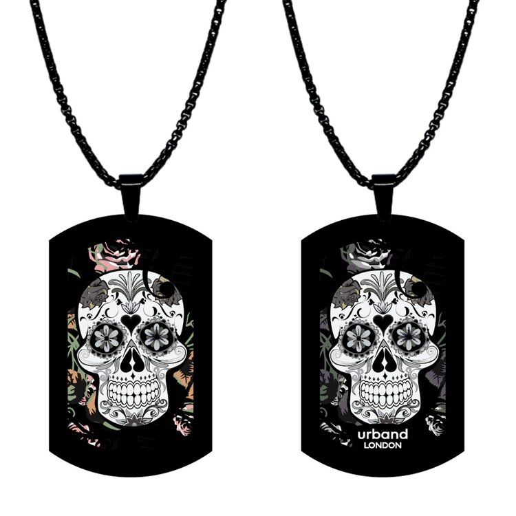 Stainless steel designer double-sided pendant 24mm handmade in London - Sugar Skulls drama Metallic