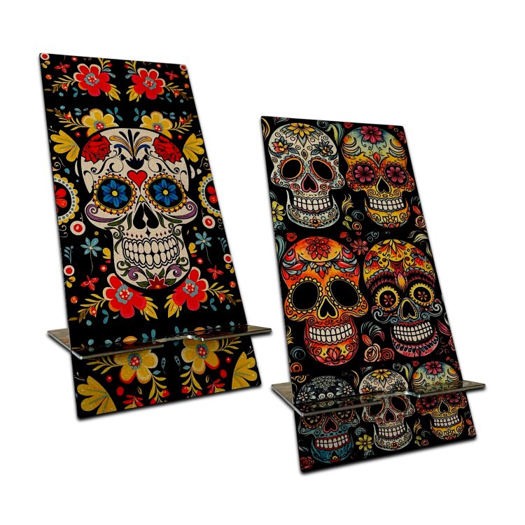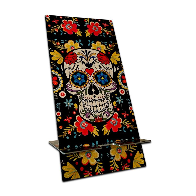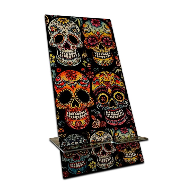 Stainless steel designer double-sided smartphone stand handmade in London - Sugar Skulls party Metallic