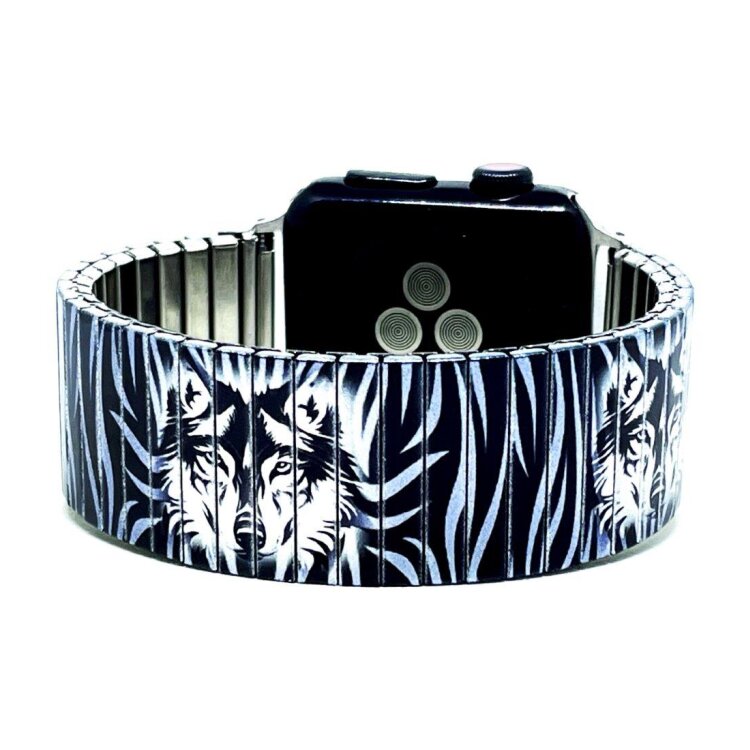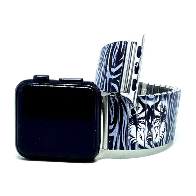 Stainless steel designer bracelet for smart watch 22mm handmade in London - Tattoo wildlands wolves Metallic