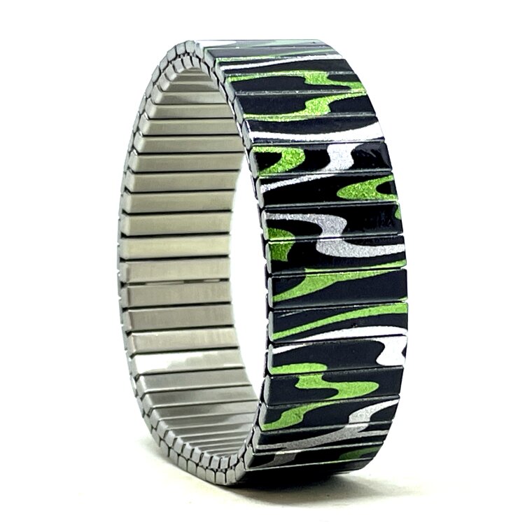Stainless steel designer bracelet 18mm handmade in London - Waves Lines black green and silver Metallic